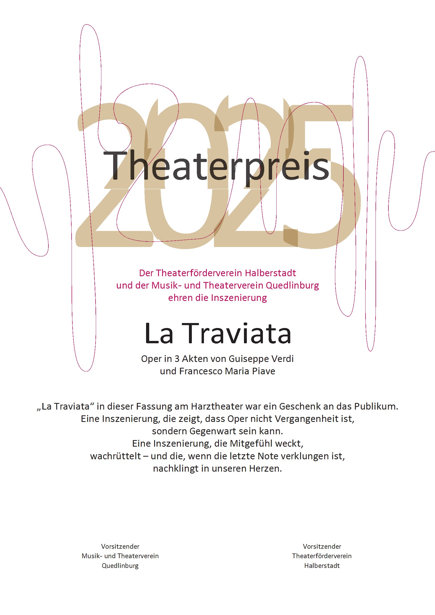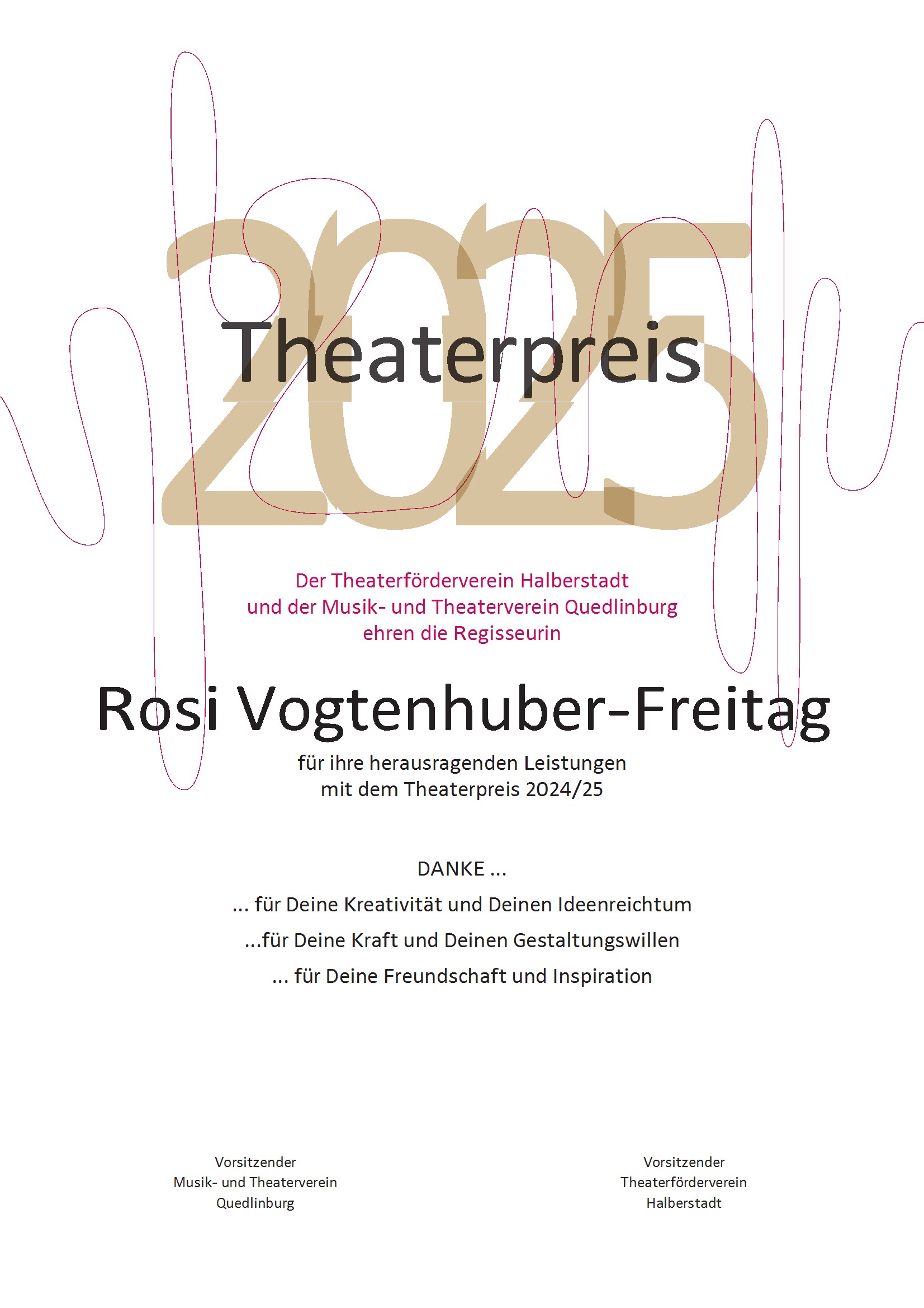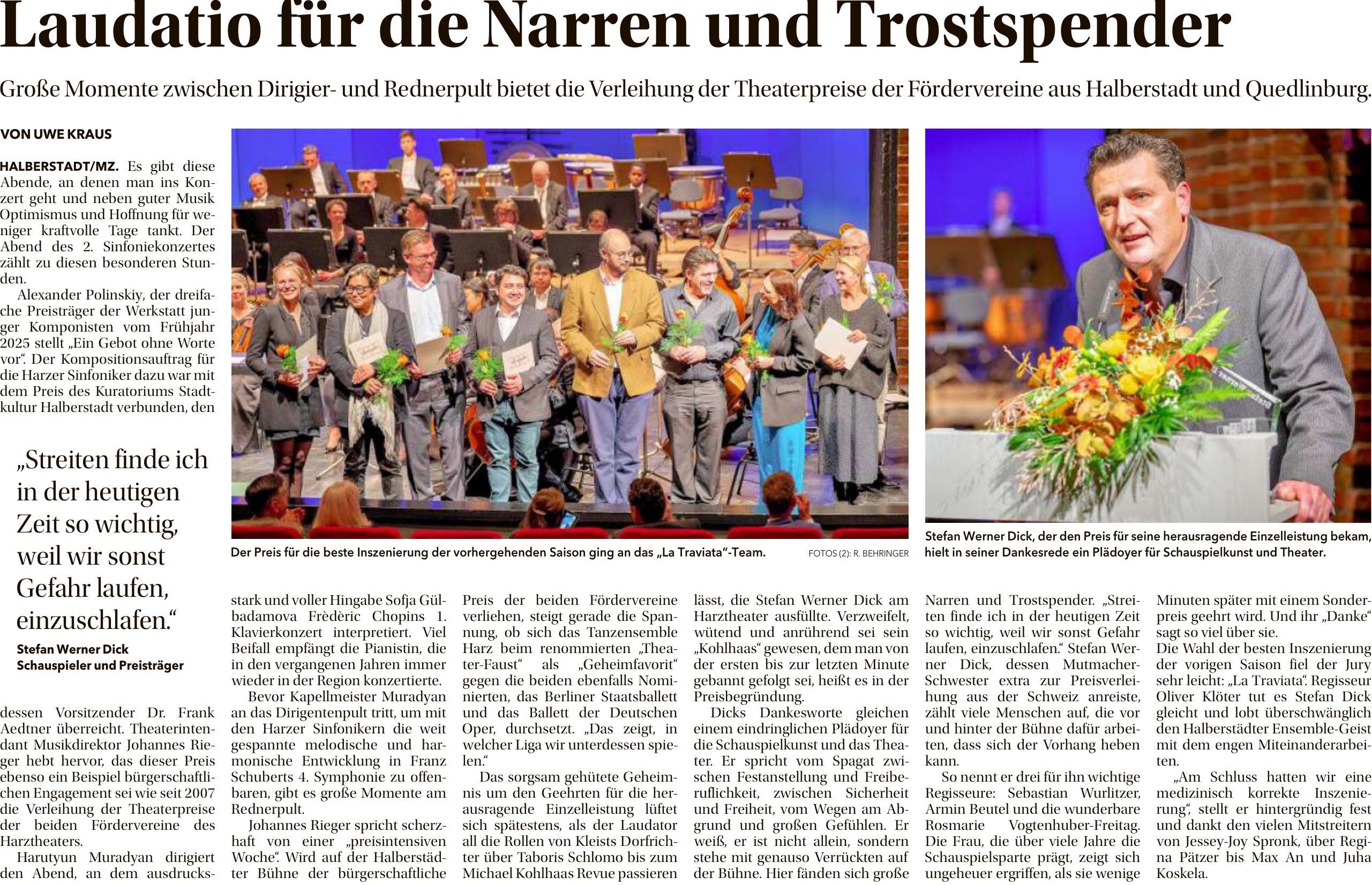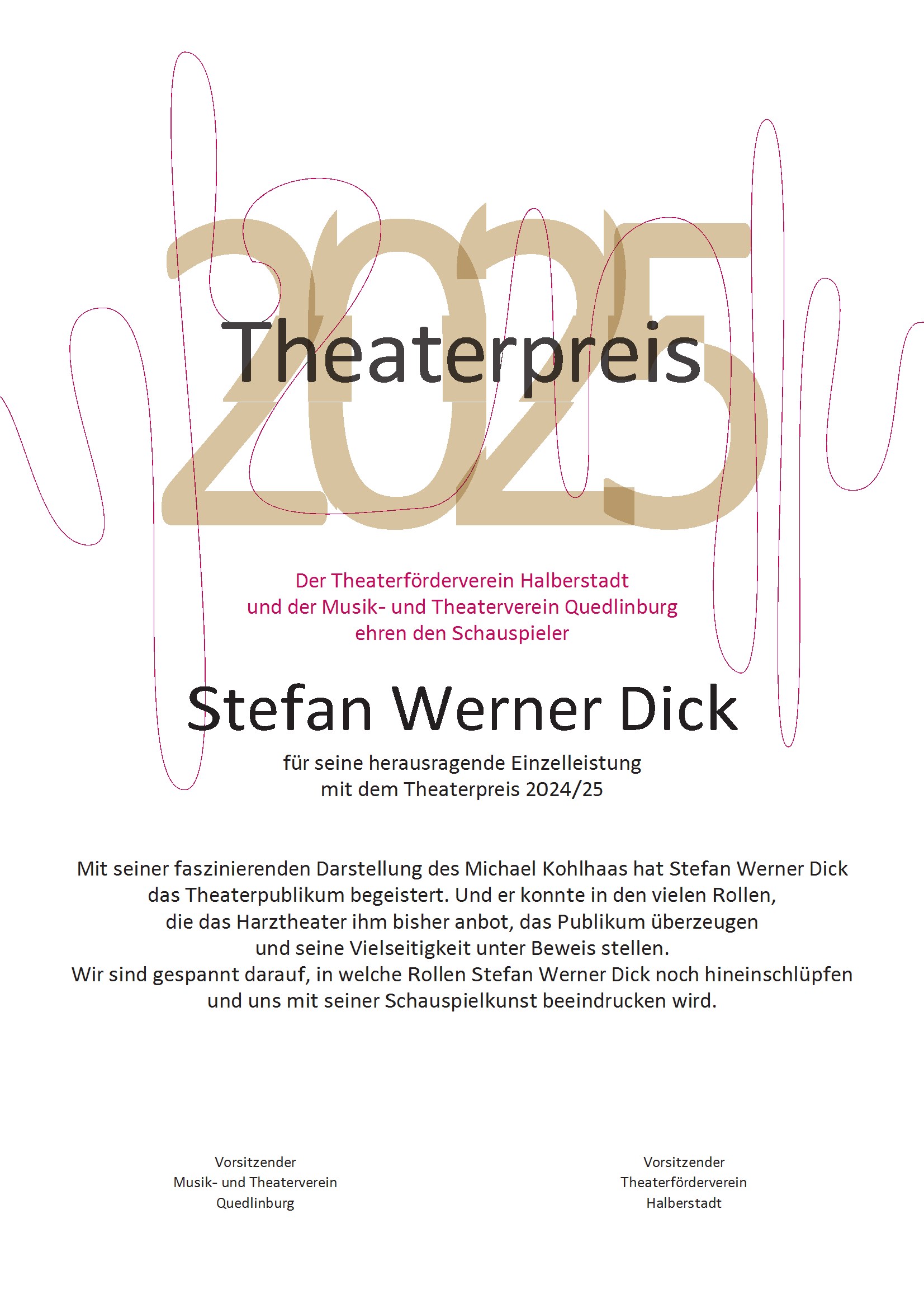 In bewährter Tradition wurden die Theaterpreise 2025 (bereits zum achtzehnten Mal) durch den Theaterförderverein Halberstadt und den Musik- und Theaterverein Quedlinburg am 14.11.2025 im Rahmen des 2. Sinfoniekonzertes der Saison im Großen Haus Halberstadt vergeben.