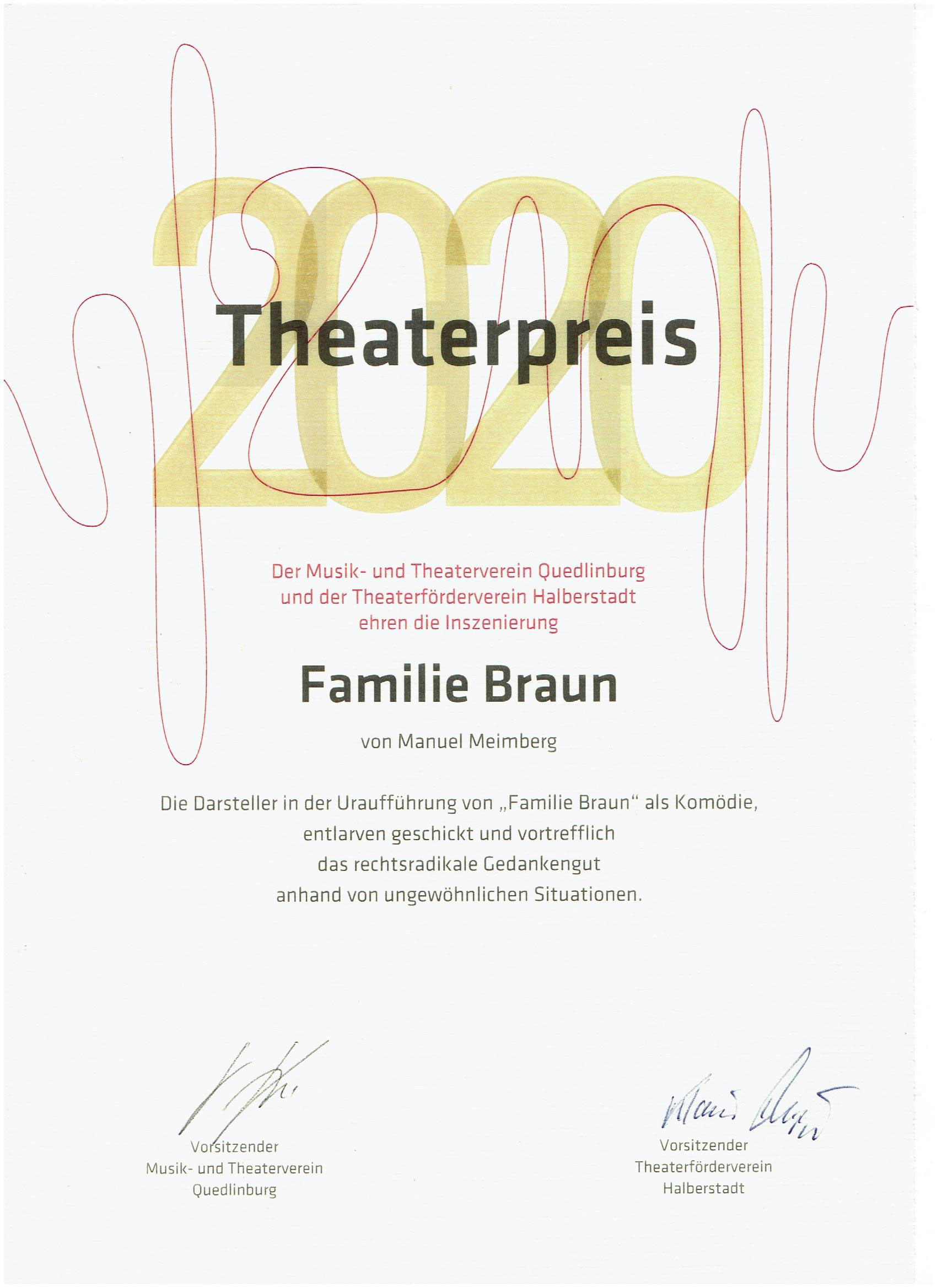 Der Preis für die beste Inszenierung wurde von der Jury an die hochpolitische Komödie "Familie Braun" in der Inszenierung von Sebastian Wirnitzer vergeben.