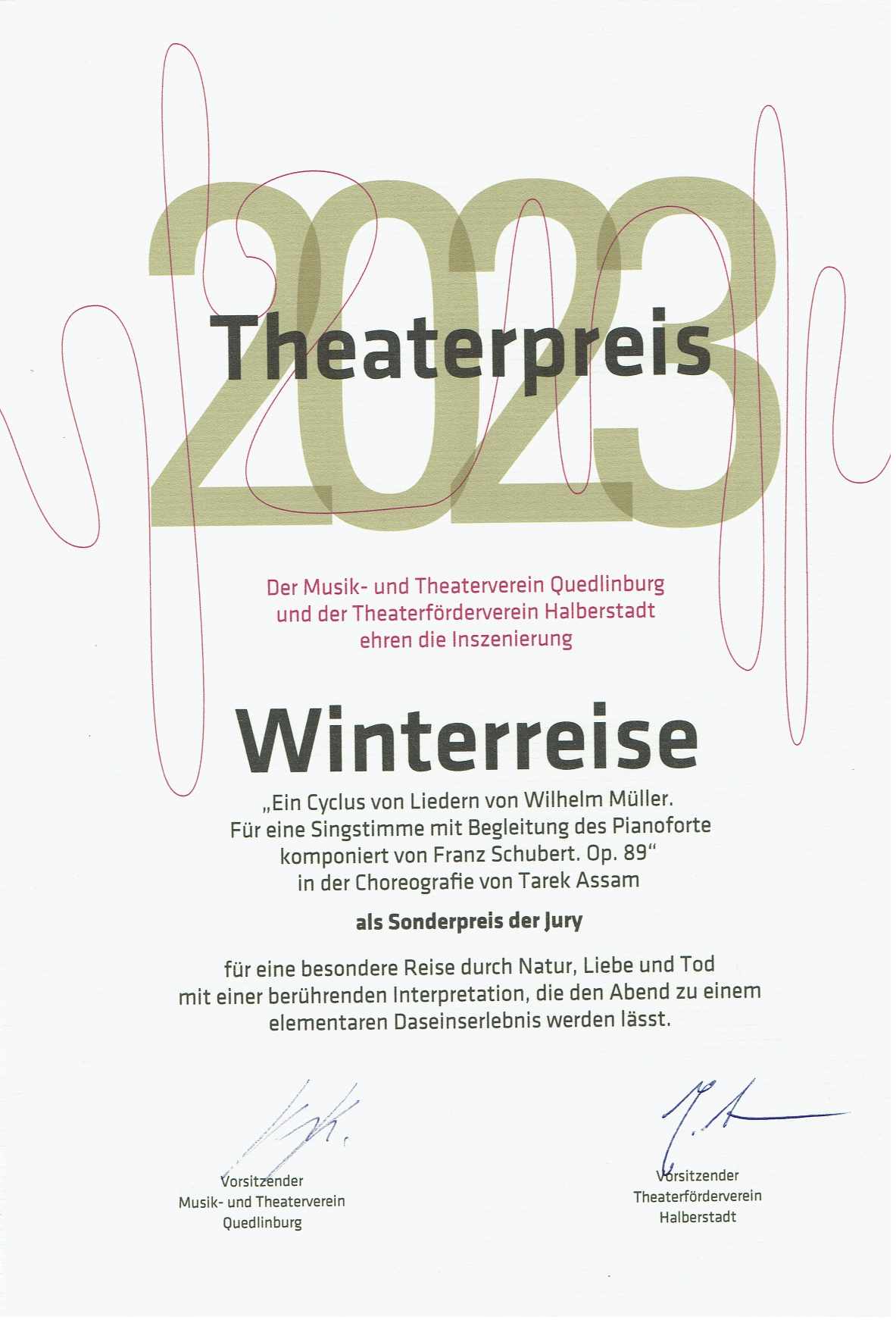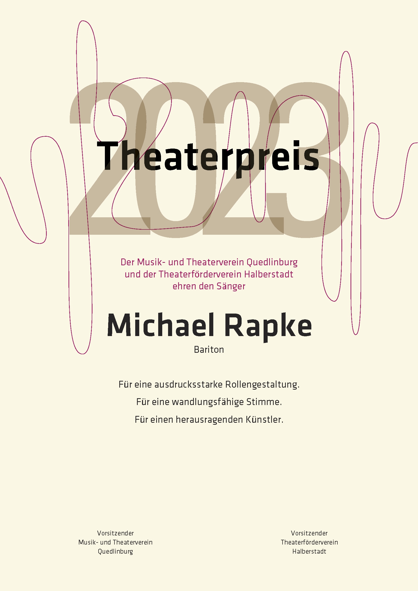 In bewährter Tradition wurden die Theaterpreise 2023 (bereits zum sechszehnten Mal) durch den Theaterförderverein Halberstadt und den Musik- und Theaterverein Quedlinburg am 11.11.2023 im Rahmen des 2. Sinfoniekonzertes der Saison im Großen Haus Quedlinburg vergeben.